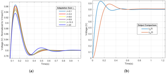 This gain was selected to reduce the settling time and, at the same time, decrease the transition of the adaptation process of the adaptive system. By including the calculation of the gradient and adaptation parameters into the error of the responses , Equation (15) is obtained.