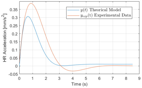 The RMSE obtained from the comparison of the signals and was , indicating the difference between the amplitudes of both functions and the periods of maximum energy consumed in the change of HR acceleration. This is good due to the statistical basis on which the HR acceleration model was developed in Equation (11), and represented in terms of time by in Equation (31). The fit of both curves, shows the coherence of directions and duration periods of the transient in both signals. Regarding the correlation, Pearson and Kendall show a strong and positive correlation between both responses. Being a negative correlation, zero indicates no correlation and 1 pointing to a perfect correlation. In this case, both are higher than , which implies a strong correlation and coherence of the responses, reinforced by a positive covariance. Therefore, the proposed HRV model is validated, as well as the method to obtain the same.