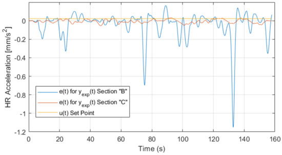 Figure 14 and Table 7 show that in segment B, the magnitude of the means with respect to HR acceleration is larger than the magnitude of acceleration in the controlled segment C. This implies that the acceleration means used in segment B are much higher than in segment C, resulting in high dispersion in HR acceleration and consequently higher power dissipation. Regarding the C segment, minimal dispersion that reaches a deviation from the mean of only is observed. Conversely, the dispersion of segment B corresponds to , demonstrating the action of the controller and the regulation of HR acceleration through biofeedback.