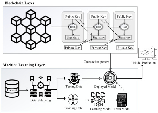The proposed system model consists of two layers: blockchain and machine learning. The blockchain model initiates transactions, and then machine learning models are used to classify these transactions as malicious or legitimate. This is a binary classification. The proposed system model is based on the integration of machine learning and blockchain for fraud and anomaly detection in the financial sector. The anomaly detection system identifies unusual suspicious events that are different from most of the data. A dataset of bitcoin transactions is used for the proposed model. We also use the random forest and XGboost classifiers to classify legitimate and malicious transactions. These classifiers are also used to predict new incoming transactions. The proposed model is trained and tested for legitimate and malicious data patterns using the given dataset. The proposed system model consists of the following steps (discussed in the below subsections).