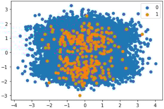 Figure 5 shows the correlation between the fraudulent and non-fraudulent class. The correlation value 1 observed for shows the maximum correlation. Meanwhile, the value almost equal to 0, in the case of , shows the minimum correlation between fraudulent and non-fraudulent.