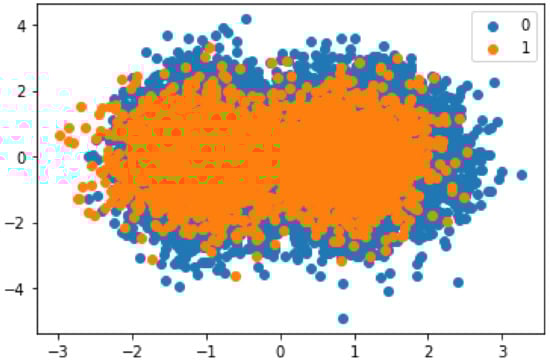 Figure 2 shows the presence of malicious and honest transactions in the dataset. It can be seen from the figure that the number of honest transactions is higher than the number of malicious transactions. This imbalanced nature of the data leads to a bias in the classification. Synthetic data are used to solve this problem. The malicious entities are oversampled using SMOTE. The synthesized transactions are added to the dataset to limit the bias of the model during classification. The results obtained after using SMOTE are shown in Figure 3.