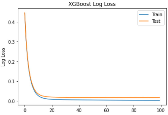 The observed log loss of XGBoost during training is shown in Figure 4. The log loss is observed for both the training data and the test data. From the figure, it can be seen that at a count of 10 iterations, a drastic drop is observed for both the training and test data. Moreover, the smoothness of the curves indicates that the model efficiently captures the nonlinear patterns of the data. For the test data, the log loss is higher than for the training data. However, the difference is not too large. The smaller difference between the training and test curves indicates that the model is well trained on unseen data. The trained model can be applied to real-world scenarios for anomaly detection in blockchain networks.