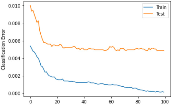 Figure 6 shows the error that occurs when classifying with XGBoost. It shows the error for both training and test data. It can be observed that the classification error decreases as the number of iterations increases. The error is high for training data, and the figure shows a gradual decrease, while it is lower for test data and decreases rapidly.
