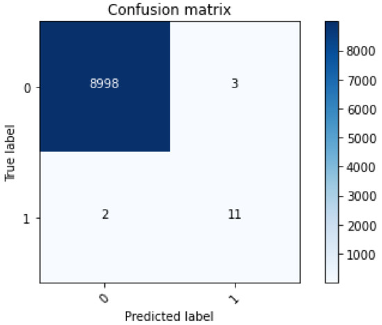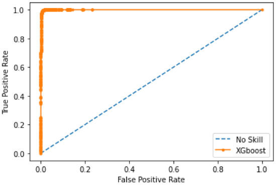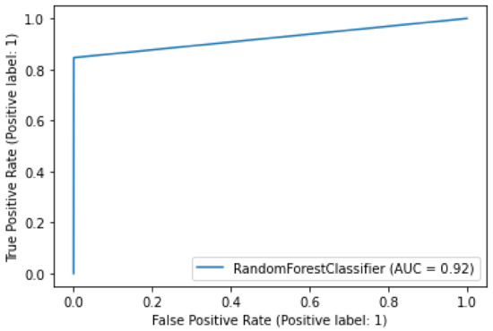 Figure 9 shows the confusion matrix obtained using RF. In this matrix, random forest selects 9014 random samples, correctly identifying 9009 predictions. This means that the proposed model efficiently discriminates between malicious and legitimate transactions. The matrix shows that the highest values are obtained in the case of true negatives, namely 99%. In the other three cases, the number of values is lower. This shows that the proposed model is efficient in detecting true negative transactions. Moreover, the phenomenon of majority voting in the random forest increases the performance of the model during classification. Figure 10 shows the AUC of a random forest. The AUC describes how well the model distinguishes between the positive and negative classes. It can be seen that the value of the AUC increases dramatically at the beginning to almost 0.85. Thereafter, a gradual increase is observed until the maximum value of 0.92 AUC is reached. The random forest model achieves an AUC of 0.92, which means that it performs well in capturing legitimate and malicious transactions.