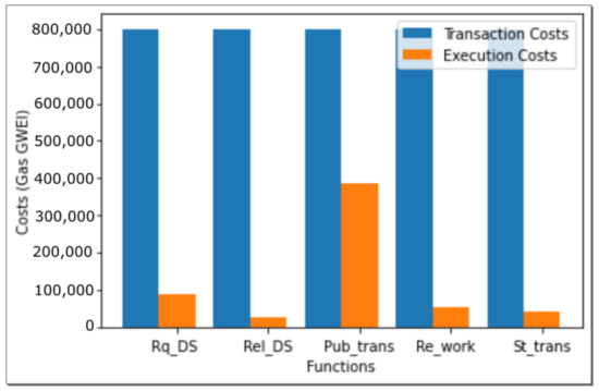 Figure 11 shows the transaction and execution costs incurred in executing the functions involved in the blockchain smart contract. The costs are expressed in terms of gas, a basic unit of gas consumption in the blockchain network. From the figure, it can be seen that the transaction costs of all functions remain the same, while the execution costs of the function are the highest, as mining costs are also included. Overall, the transaction costs are higher than the execution costs for all functions. The reason for this is that the former includes the processing costs of entire transactions, while the latter includes only the execution costs of some operations in a given function.