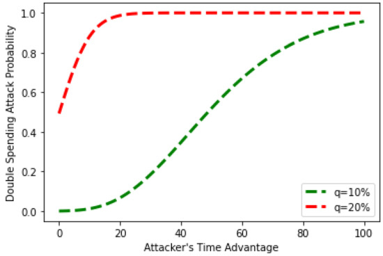 In the proposed work, the impact of a double-spending attack is assessed using the time advantage, computational power, and the number of pre-mined blocks. The number of pre-mined blocks is utilized as an input in Figure 12. The double-spending attack occurs after only a few blocks are created for values of q greater than 40%. It means that as the value of q rises, the probability rises with it, and once an attacker has control over the network, the chances of a double-spending attack become high. The probabilistic values close to 0 indicate that the double-spending attack will fail, while values close to 1 indicate a more significant success percentage for the double-spending attack.