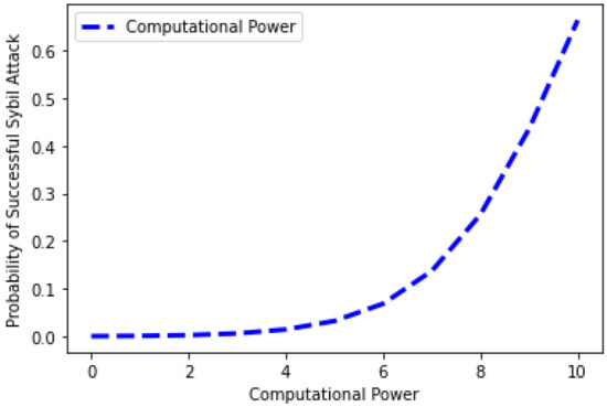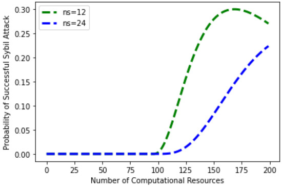 In Figure 13, the evaluating parameters of Sybil attack are given, such as different Sybil identities ns = 12 and 24, number of nodes, and the computational power of the attacker node. The given figure shows the probability and impact of different Sybil identities in the network. It is observed from the figure that when the number of Sybil identities is 12, and computational resources are 0, then the probability of a Sybil attack is zero. However, the probability of a Sybil attack is increased when the computational resources are increased from 100 with 12 Sybil identities. It shows that if the attacker increases the computational resources, the probability of a Sybil attack becomes high. Moreover, when the Sybil identities are increased up to 24 with the computation resources equal to 125, the probability of a Sybil attack is zero. However, when the computational resources of Sybil identities are increased beyond 125, the probability of an attack is also increased. The graph depicts that the probability of a Sybil attack becomes high when the number of Sybil identities and computational resources is high. The findings reveal that the number of Sybil identities established by hostile people determines the likelihood of a Sybil assault. The mathematical definition of the probability of a Sybil attack’s success is shown in Equation (4).