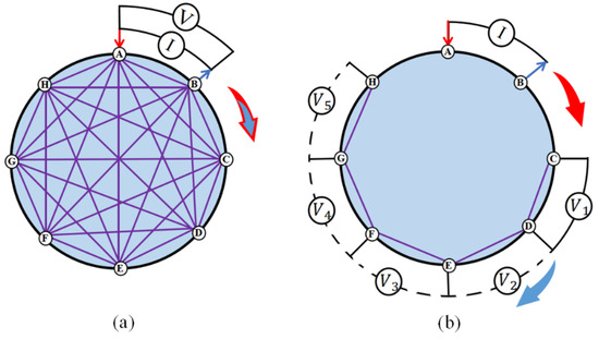 Two drive patterns. (a) Two-terminal scheme with eight electrodes. (b) Four-terminal scheme with eight electrodes. In the figure, the I represents the location of the injected excitation, and V represents the location of the voltage measurement. The red and blue arrows represent the direction of movement of the excitation and measurement electrodes, respectively.