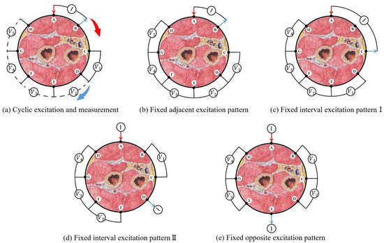 We discuss four fixed excitation patterns for the eight-electrode EIT system and compare them with the traditional cyclic excitation and measurement pattern, as shown in Figure 3. Figure 3a is traditional cyclic excitation and measurement pattern. Figure 3b–e are the fixed excitation measurement patterns used in this paper. According to the different positions of the excitation electrodes, it can be divided into a fixed adjacent excitation pattern, fixed interval excitation pattern, and fixed opposite excitation pattern. The measurement process of the fixed excitation pattern is as follows: during the gesture change process, a current signal is continuously applied to the selected excitation electrode pair, and then the resulting voltages between adjacent passive electrode pairs are measured cyclically.