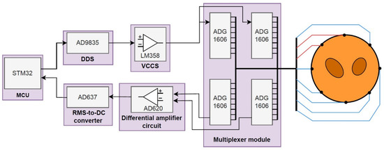 The entire EIT system architecture is shown in Figure 1. It consists of three parts: a data acquisition unit, system hardware unit, and data processing unit. The operation process of the gesture recognition system is roughly as follows. First, the optimal excitation measurement pattern is selected according to different measurement tasks. Then, the impedance data of the arm under different gestures is measured by the data acquisition system. Finally, the collected gesture data are sent to the computer for further data processing and hand gesture recognition.