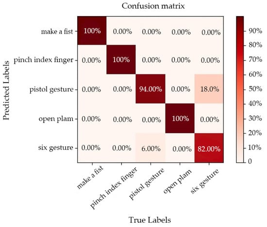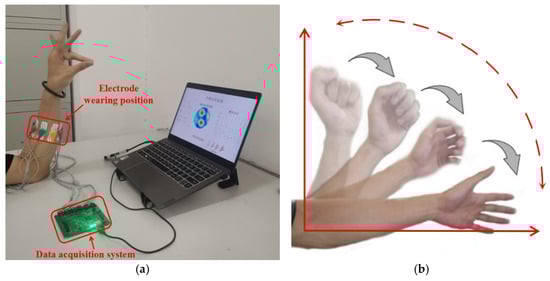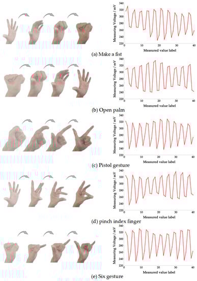 We recruited five healthy volunteers to participate in the experiment. The volunteers included 2 women and 3 men, all aged from 22 to 25 years old. Data acquisition can be achieved by volunteers completing hand gestures within the measurement time. In all experiments considered in this study, the left arm was used as the measurement object, and the electrodes were uniformly worn ten centimeters below the wrist, as shown in Figure 6a. Volunteers were asked to wash their arms with disinfectant alcohol and purified water before data acquisition. During data acquisition, volunteers were asked to put their arms on the table to keep them stable. We selected five dynamic gestures that are most commonly used and easy for volunteers to imitate and learn as classification objects, namely make a fist, open palm, pistol gesture, pinch index finger gesture, and “six” gestures. At the beginning of the experiment, the volunteers imitated the dynamic hand gestures displayed on the screen according to the prompts. After collecting 40 sets of hand gesture data, the volunteers were prompted to imitate a new hand gesture. This process was repeated until the volunteers completed data collection for the five hand gestures. This indicated that one iteration was completed. Volunteers were advised to rest for five minutes before each new gesture to prevent arm muscle fatigue. Each volunteer needs to go through four iterations, namely a session, without taking down or moving the device. The process resulted in 4000 sets of data (5 participants × 5 gestures × 40 sets of data × 4 iterations). The dynamic gesture set and the measurement results of different gestures are shown in Figure 7.