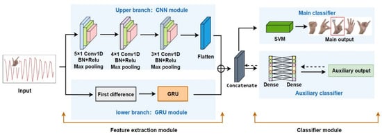 In order to improve the generalization of the classification network, the network structure is redesigned in this paper. A dual-channel feature extraction network based on CNNs and Gated Recurrent Unit (GRU) [30] is proposed (i.e., the CG-SVM network). This classification network consists of two parts: feature extraction module and classifier module. As shown in Figure 8. The feature extraction module has upper (CNNs) and lower (GRU) branches. The output feature vector from feature extraction module are fed into the classifier for classification.