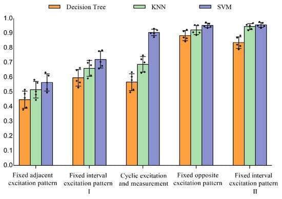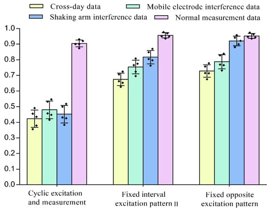 The classification results of normal data and interference data under different excitation patterns are shown in Figure 10. From the classification results of the SVM algorithm, the classification accuracy of the traditional cyclic excitation and measurement pattern dropped significantly in the three interference experiments. The classification accuracy of the other two fixed excitation patterns is also decreased, but was still significantly better than the cyclic excitation and measurement modalities (pairwise p < 0.001, d ≥ 25). This further reflects the advantages of the proposed fixed excitation measurement pattern in the interference environment. Compared with the fixed interval excitation patternⅡ, the fixed opposite excitation pattern performs better in the classification task of interference data, especially in the shaking arm interference test, the classification accuracy is significantly better than that of the fixed interval excitation patternⅡ (p < 0.009, d = 11.3).