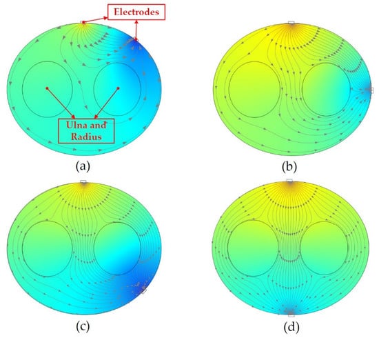 We conducted a simulation analysis to explain the advantages of fixed opposite ex-citation pattern in anti-interference experiments. The simulation result is shown in Figure 11. The excitation electrodes were applied with a current of 300 µA, which is the same with the real EIT system. The conductivity of the arm bone was set to 0.02043 S/m, and the conductivity of the arm muscle was set to 0.5448 S/m [36,37].
