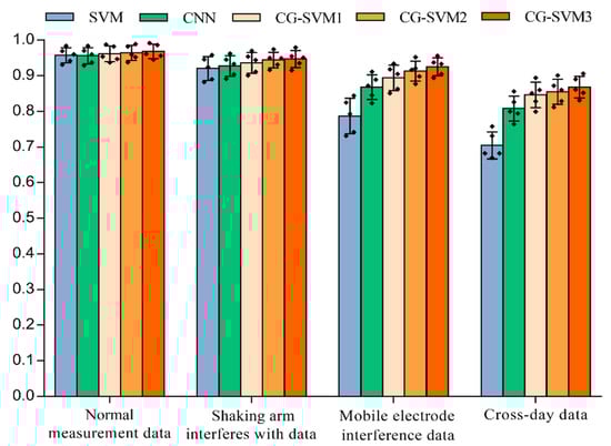 The recognition results of different types of data under different networks are shown in Figure 12. Compared with the SVM algorithm and the CNN network, the recognition accuracy of the CG-SVM3 network is dramatically improved, especially for interfered data. In the moving electrode interference experiment, the classification accuracy of CG-SVM3 network is 92.5%, which is 13.8% and 5.7% higher than SVM algorithm and CNN network respectively (p < 0.006, d = 13.8 and p < 0.05, d = 5.7). In the classification task of cross-day data, the classification accuracy of CG-SVM3 network is 14.2% and 6% higher than that of SVM algorithm and CNN network, respectively (p < 0.008, d = 14.2 and p < 0.05, d = 6). This further confirms the excellent feature extraction ability and anti-interference ability of the newly designed classification network.