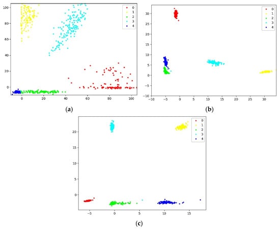 The output feature map of the network under different loss functions: (a) SoftMax loss; (b) center loss; (c) center distance loss. The points with different colors denote features from different classes.