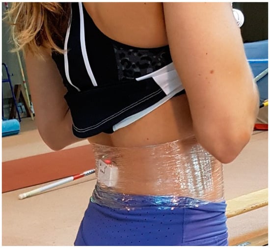 The athletes were informed about the objectives and performed a warm-up as indicated by their coaches in order to prepare for the training monitoring and control session. The investigator explained the protocol to all athletes. Before initiating the task, the IMU was calibrated. The athlete stood still for about 30 s, in order to obtain the base acceleration, and performed a previous jump to set initial criteria for both instruments. The athlete began from the static upright position and performed a knee flexion at 90° followed by a jump, finalizing in the initial position with arms placed at the waist. The jump was performed on an FP with the IMU placed at L5 as a reference for the CoM [11,12,13,14,18,19]. The instruments were fixed on the skin at L5 using adhesive tape (see Figure 1). The data were automatically synchronized through a Python routine, allowing us to simultaneously collect all data in the same file. Each coach defined the number of jumps performed by their athlete (between three and five CMJs), with a minute of rest between jumps, performing a total of 30 CMJs.