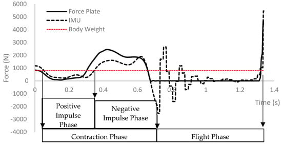 Through a qualitative analysis, the performance was found to be similar when comparing IMU and FP data in the contraction phase. However, the flight phase was not similar, as expected, because there was no contact with the platform, while the IMU was always connected to the athlete. Regarding the signal structure, our study followed that of Chiang et al. [23] (p. 82), with maximum peaks before and after the minimum peaks. However, the flight phase criteria were not equal; the authors indicated zero acceleration, while we indicated a phase between the minimum and maximum peak (Figure 3, Flight Phase). Markovic et al. [19] (p. 4) showed a different way to characterize the flight time, using the maximum peaks of the absolute acceleration.
