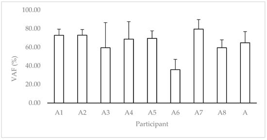 Variance accounted for, for each participant (A1–A8). A is the mean value for all participants.