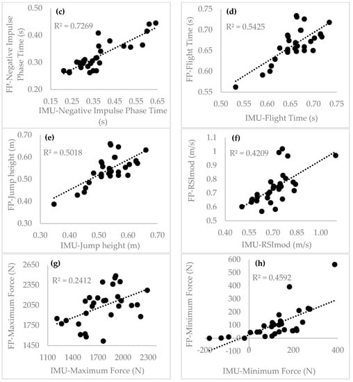IMU vs. force plate correlation analysis: (a) contraction time (s); (b) positive impulse phase time (s); (c) negative impulse phase time (s); (d) flight time (s); (e) jump height (m); (f) RSImod (m/s); (g) maximum force (N); and (h) minimum force (N).