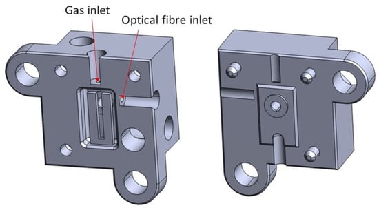 STEP models for additive manufacturing of the two monolithic stainless-steel parts of the TFEPAS ADM. The red arrows indicate two small apertures, giving access to the gas sample for analysis and to the optical fiber for interferometric readout.