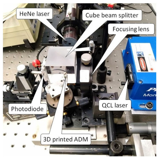 The interferometric readout has already been proved to give results comparable to a piezoelectric readout in terms of both sensitivity and signal-to-noise ratio [19]. In this study, the feasibility of the interferometric readout was verified on an AM stainless-steel tuning fork. While a flat polished surface is desirable to maximize reflection from the metallic tuning fork, the surface finish resulting from the MMLS process appears rough and opaque. This can be seen in Figure 2C, which shows details of the ADM with a portion of the fork prongs in front of the circular aperture of the acoustic micro-resonator. The actual roughness of the AM surfaces measured by profilometry was found to have an average value of approximately 1.5 microns, with peak-to-peak values even greater than 10 microns. We have solved the problem with mechanical polishing of the surface of the fork where the optical interrogation takes place. Prospectively, mechanical polishing shall be replaced by wet or plasma polishing. A test bench, which is depicted in Figure 3, was set up to verify the functionality of the AM tuning fork as a resonant element and demonstrated the feasibility of its vibration amplitude measurement by interferometric readout. The set up essentially consists of one HeNe laser (Uniphase, model: 1103P), one photodiode (OSI Optoelectronics, model: OSD1-0), one cube beam splitter, the AM part of the ADM, plus supports and micro-manipulators for precision positioning. The components are arranged into a Michelson interferometer configuration, as shown in Figure 4A, to interrogate the lateral surface of the tuning fork. A Quantum Cascade Laser (QCL Monolux from Pranalytica) is used to stimulate the tuning fork vibration. Vibration can be induced by photothermal excitation, i.e., by focusing laser pulses directly on the fork. Alternatively, it can be induced by photoacoustic excitation as in a QEPAS sensor, i.e., by focusing the laser pulses on the gap between the prongs in the presence of a gas that absorbs the laser radiation. In both cases, the interferometric readout signal is obtained by extracting the component of the photodiode signal at the same modulation frequency of the QCL, by means of a spectrum analyzer (Stanford Research Systems, model: SR780).