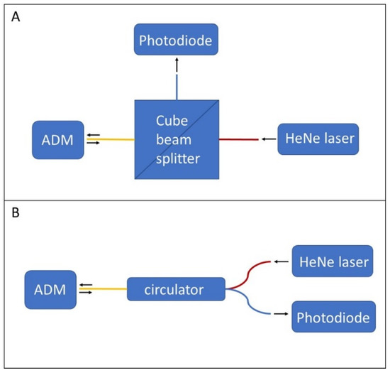 Optical schemes for the interferometric readout system. (A): free space solution based on a cube beam splitter; (B): more embedded solution based on optical fiber circulator.