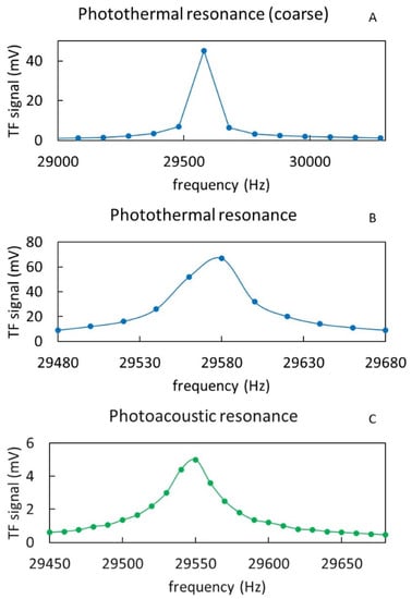 Response of the AM tuning fork to coarse- (A) and fine-tuning (B) of the photothermal excitation around the resonance frequency. Similar response to photoacoustic excitation frequency around the resonance frequency (C).