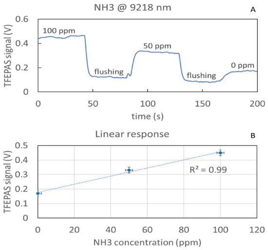 Real time measurement of the TFEPAS signal acquired while flushing different concentrations of ammonia (A) and corresponding scatter plot showing the linearity of the response (B).