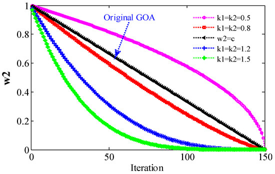 In GOA, decreases linearly, which means that the interaction force between grasshoppers decreases linearly, and the moving speed of grasshoppers near the target also decreases linearly. Therefore, there are two flaws in this strategy: (1) the inner decreasing speed is too fast, which will cause the force between the grasshoppers to be very small, so the large-scale parameter space will be missed; and (2) if the outer decreases too slowly, the grasshopper near the target will move too fast, so the global optimal solution will be lost.