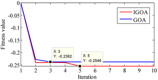 Compared with the original GOA (), the decrement strategy (outer , ) has a fast decrement. This means that the movement speed of grasshoppers near the target decreases quickly. The grasshopper moves slowly in a small search space near the target, so the algorithm can obtain the global optimal solution. Theoretically, the second problem of GOA can be solved. The above two strategies are called IGOA, and the effects of different parameters will be discussed in the comparative experiments.