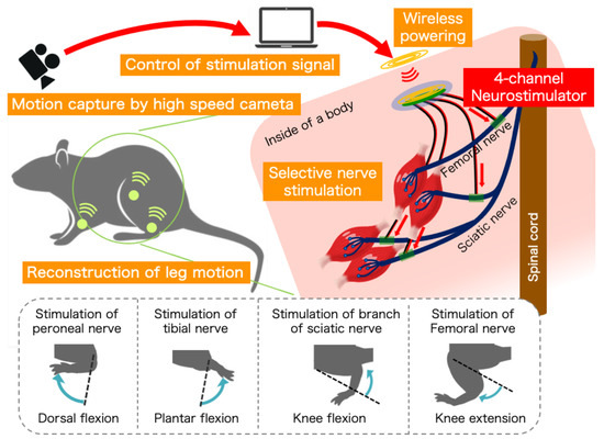 In this study, a wirelessly powered four-channel neurostimulator was developed to conduct FES for four nerves in a rat selectively to generate ankle and knee motions, as shown in Figure 1: the tibial and peroneal nerves were related to ankle joint motion and the femoral nerve and branch of sciatic nerve connected to femoral biceps were related to knee joint motion. A magnetic resonance method [24,25] was employed to conduct wireless powering to the neurostimulator, which was developed based on our previous study [20,21].