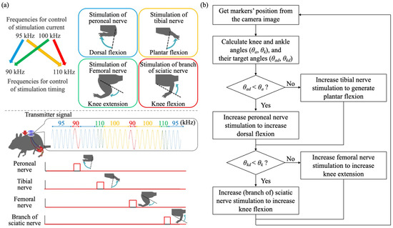 A schematic indicating the selective stimulation of the rat’s four nerves to generate ankle and knee joint motions by switching the frequency of the transmitter signal. (a) A schematic of switching the frequency of the transmitter signal to generate four different motions to the rat’s hind leg. (b) Flowchart of nerve stimulation for 2 joint control.