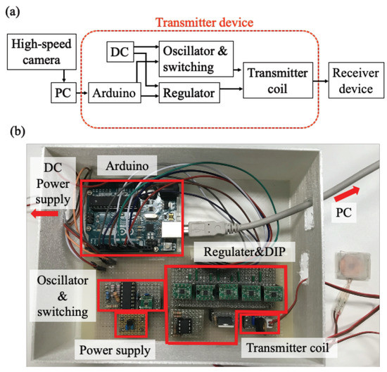 In this study, rat ankle and knee angles were controlled using the developed four-channel neurostimulator with visual feedback control. The transmitter device, which was used to send a control signal to the receiver device for visual feedback control of the rat ankle and knee angles, was prepared, as shown in Figure 3. Figure 3a indicates the information flow of the transmitter device. The transmitter device had a microcomputer to receive information from a PC about which nerve should be stimulated and how much current should be applied to the target nerve. An oscillator and switching circuit received the information from the microcomputer and controlled the frequency of the transmitter signal, as the frequency was used to send information to the receiver device about the selection of stimulating a nerve. A voltage regulator adjusted the amplitude of the transmitter signal by the output from the microcomputer to send information about the stimulation current to the receiver device. Figure 3b is the fabricated transmitter device. The transmitter coil in the device was 18 mm in diameter, 26 F self-inductance, and 25 quality factors.