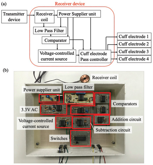 Figure 4 explains the information flow of the receiver circuit and fabricated receiver device. Figure 4a indicates the system flow of the receiver device. The device had a receiver coil to receive power from a transmitter coil. A low pass filter and comparators were used to detect which frequency was sent from the transmitter coil. In the device, three comparators were employed: the first comparator was “on” when the frequency of the transmitter signal was more than 110 kHz, the second one was “on” when the frequency was less than 90 kHz, and the third one was “on” when the frequency was more than 100 kHz. The third comparator combined with a delay circuit and could stay in “on” condition for 1 ms even if the frequency of the transmitter signal became less than 100 kHz. Therefore, the third comparator and the first or second comparator could be kept in “on” condition simultaneously. To switch the output electrode, a combination of two signals was used: one was the output from an adder circuit of the first and second comparators, and the other was the output from the third comparator.