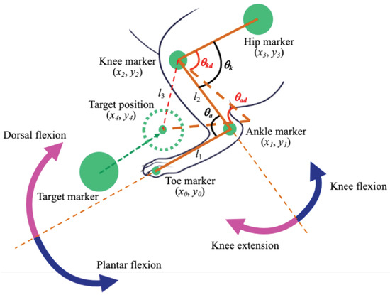 The target angle of knee joint was calculated from the position of the target marker (, ) in Equation (7):