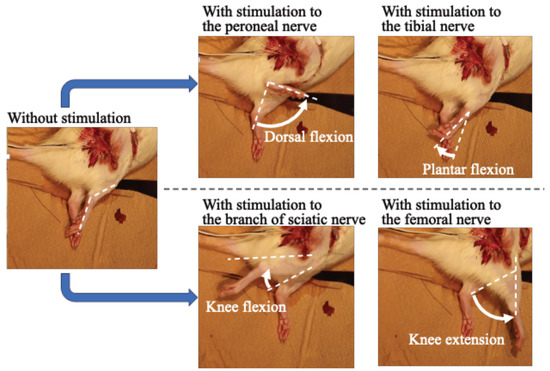 The experimental results of stimulating four nerves in order are shown in Figure 7. Thus, the plantar/dorsal flexion of the ankle joint and flexion/extension of the knee joint were observed when the stimulation to the tibial nerve, peroneal nerve, branch of the sciatic nerve, and femoral nerve were conducted, respectively. Hence, the results showed that the developed four-channel neurostimulator could generate dorsal/plantar flexion of a rat ankle joint and flexion/extension of a rat knee joint by design.