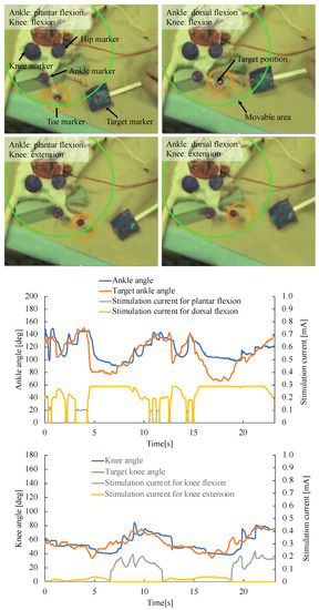 Figure 8 shows the experimental results when the ankle and knee joints were largely moved. In the experiment, the target marker was moved manually by observing the monitor, which indicated the target position of the toe with an orange circle and the limitation of a movable area with the green circle. The movable area was determined from the lengths and in Figure 5. If the target position of the rat toe was moved to the outside of the movable area, the nerve stimulation signal was not renewed, and the previous stimulation signal was applied to the nerves. When the target position was in front of the leg and close to the rat body, the ankle joint showed dorsal flexion, and the knee joint showed extension, as shown in the lower-right photo in Figure 8. When the marker was moved behind the leg, the knee joint was changed to flexion, as shown in the upper-right photo in Figure 8. The ankle joint became plantar flexion when the target position was moved far from the rat body, as shown in two photos of the left side in Figure 8. The graphs indicate the motion of ankle and knee joints in the experiment. Thus, the rat toe position was controlled in the range of 92 to 152 degrees at the ankle joint and 40 to 79 degrees at the knee joint by changing the angles of the rat ankle and knee joints. However, the motion control should be faster to reconstruct functional motions such as walking.