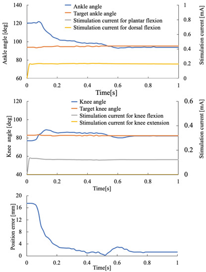 The range of stimulation current to the four nerves was checked before starting the visual feedback experiment. At first, the stimulation current of the peroneal nerve was gradually increased, and the minimum stimulation current of the peroneal nerve was found when the ankle leg started towards dorsal flexion. Then, the stimulation current was gradually increased, and the maximum stimulation current of the perineal nerve was found when the ankle became the maximum angle of dorsal flexion. In the same procedures, the range of the stimulation current was found for the tibial nerve and , for the branch of the sciatic nerve and , and for the femoral nerve and , respectively. In our experimental setup, each value was fixed as follows: = 81 A, = 354 A, = 117 A, = 156 A, = 81 A, = 90 A, = 58 A, and = 100 A. The stimulation currents in each nerve were controlled in the range.