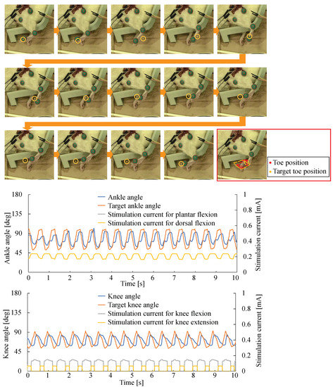 Reconstruction of walking trajectory by ankle and knee joints control. Upper photos indicate the motion of the rat leg during one cycle of the walking trajectory (the orange dot in the orange circle indicates the target position of the rat toe). The right bottom photo (inside the red rectangle) shows the trajectory of the rat toe and the target rat toe in the experiment. Lower graphs show the joint angle, target joint angle, and stimulation currents to the nerves during the experiment.