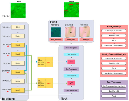 In this paper, the proposed method FA-CenterNet structure consisted of input, backbone, neck, head, and output networks. Figure 1 presents the overall network architecture of FA-CenterNet. In order to better complete the task of holothurian detection, the main improvements in this paper were to design and utilize the better lightweight network (EfficientNet-B3) as the backbone network of CenterNet, add two FPT (feature pyramid transformer) modules with different feature combinations between the backbone and neck networks, and use AFF modules to achieve feature fusion.
