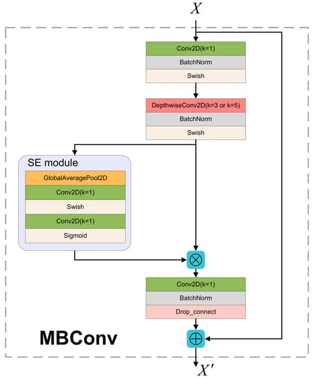 MBConv mainly refers to MobileNet v2’s inverted residual structure and adds SE modules. The structure of MBConv is presented in Figure 2. In MBConv, when the expand ratio was 1, the input feature skipped the 1 × 1 convolution of the first layer and went directly to the Depthwise Separable Convolution module. When stride was two, the feature size shrank to 1/2 of its previous size. MBConv uses both the Depthwise Separable Convolution Strategy and SE Module, enabling EfficientNet-B3 to have an advanced performance in precision, Params, and FLOPs.