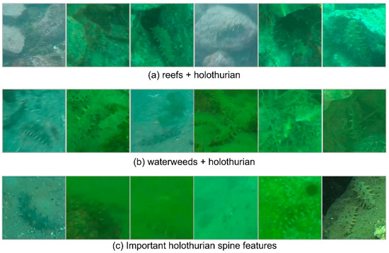 Holothurians have a good ability to protect themselves: their main body color can change with the environment’s color, so the body characteristics of holothurians and the environmental characteristics are highly similar. This is also the greatest challenge in holothurian-detection missions. As presented in Figure 3, the characteristic color of holothurian spines does not change with the color of the environment, but takes on a steady yellow-green cone shape. In addition, holothurian living environments generally have reefs, waterweeds, and other ecological scene information. These features from different sizes and spaces often exist in the same scene as holothurians, especially the small target holothurian spines from the lower networks. We believed that capturing the scene information was beneficial to the detection of fuzzy holothurians and will be a breakthrough to improve the detection performance of holothurians.