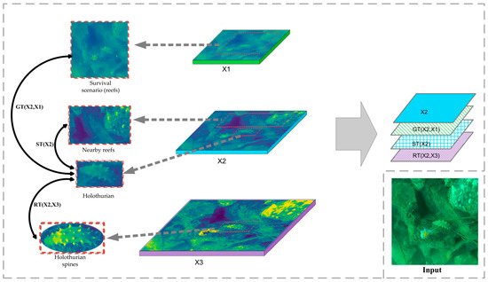 As presented in Figure 5, to understand FPT in more detail, we obtained one of the FPT modules from the structure presented in Figure 4 as an example for detail analysis. The feature combination of the selected FPT models was (X1, X2, X3). X1, X2, and X3 represented the network’s high-level, mid-level, and low-level features, respectively. X3 details (e.g., obvious holothurian spines) interacted with X2 mid-level information (e.g., holothurian) to obtain the new feature RT (x2, x3). The holothurian features of X2 interacted with habitat features, such as reefs, to obtain a new feature, ST (X2). The high-level information of X1 (e.g., holothurians and ecological scenarios) interacted with the holothurians features of X2 to obtain the new feature GT (x2, x1). Then, three new features were combined with the original feature X2 to obtain the FPT output.