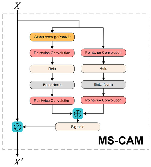 The core module of AFF [23] (attentional feature fusion) is MS-CAM and its structure is presented in Figure 6. Compared to SENet, MS-CAM not only extracts attention from global features, but also from channels with local features, with richer attention information. MS-CAM uses a combination of Global Branch + Local Branch. Unlike the local branch, the global branch adds an extra Global Avg Pooling. Global branching is used to extract attention from global features, helping models distinguish holothurian features from large-scale seafloor environments. The local branch uses pointwise convolution to extract channel attention for local features, which helps to enhance the model’s focus on the local features of holothurians (e.g., holothurian spines).