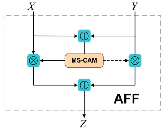 When AFF modules are used in feature pyramid structures, input feature X is the low-level detail feature of FPT output and input feature Y is the high-level semantic feature of the neck network. Based on MS-CAM, AFF’s computational equation can be expressed as follows: