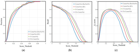 Figure 8 presents the precision, recall, and for four models of ablation experiments as the confidence thresholds change. The score threshold is also called the confidence threshold. The is a harmonic average of model precision and recall rates. Additionally, a higher means the model has a better performance. The calculation of the is presented in Equation (2):