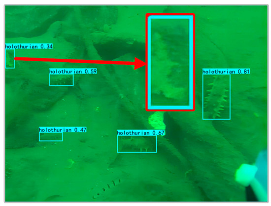We trained and validated our method on the CURPC 2020 dataset. Additionally, the CURP 2020 dataset is the official dataset provided by China’s underwater robot professional contest in 2020. There are 8200 images in the dataset, which included “holothurian”, “echinus”, “scallop”, and “starfish”. The dataset is in a VOC2007 format. Due to the large number of images in the CURPC dataset without holothurian targets, the quality of the model training was affected. Therefore, we read the XML file through the Python command and extracted the image containing the holothurians. In this work, 3333 images of holothurians and corresponding xml label files were extracted, including 1273 images at (3840, 2160) resolutions, 388 images at (1920, 1080) resolutions, 1671 images at (720, 405) resolutions and one image at (586, 480) resolutions. Additionally, there were 7214 holothurian targets in the 3333 images. The target holothurian in this dataset had the characteristics of multi-scale and overlapping, image blurring, low contrast, and occlusion, which made the target recognition more difficult. In order to demonstrate the robustness of the proposed method, the dataset image was the original real underwater image, without any image enhancement, closer to the real holothurian-fishing scene.