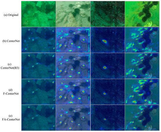By comparison, FA-CenterNet, which increased the FPT and AFF modules, significantly increased the model’s attention to fuzzy features, small size, and high-overlap holothurians at a lower Params and FLOPs cost. The visualization of the heatmap proves the validity of our method.